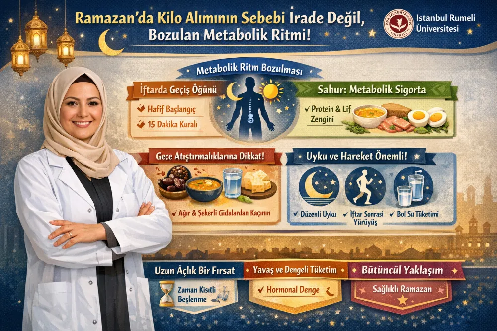 MHA - İstanbul Rumeli Üniversitesi Beslenme ve Diyetetik Bölümü’nden Dr. Öğr. Üyesi Hatice Pınar Kural Enç, Ramazan ayında yaşanan kilo artışlarının arkasında sanılanın aksine "irade zayıflığı" değil, vücudun biyolojik saatinin ve metabolik ritminin sarsılmasının yattığını belirtti. Enç'e göre, sahur ve iftarın doğru planlanması durumunda bu kutsal ay, bir kilo verme avantajına dönüştürülebilir.