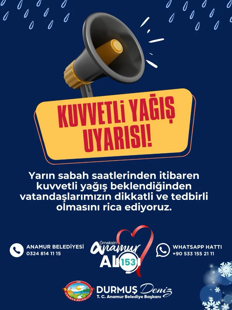 "Kıymetli hemşehrilerim, Meteoroloji’den alınan son veriler ışığında Anamur, Bozyazı ve Aydıncık hattında çok ciddi bir yağış dalgası bekliyoruz. Yarın sabah saatlerinden itibaren etkisini artıracak olan yağışların neden olabileceği ani sel, su baskını, yıldırım, yerel dolu yağışı ve kuvvetli rüzgar gibi risklere karşı tüm vatandaşlarımızın azami derecede tedbirli olmalarını rica ediyorum. Özellikle kıyı bölgelerimizdeki hortum riskine ve yüksek kesimlerdeki tipi ihtimaline karşı hazırlıklı olmalıyız."