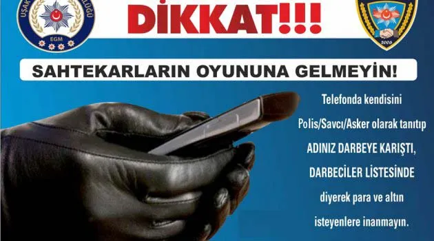 Dolandırıcılık vakalarında en sık karşılaşılan yöntemlerden biri olan "sahte kamu görevlisi" profilinin altı çizildi. Yapılan uyarıya göre; Polis, Jandarma, Cumhuriyet Savcısı veya herhangi bir kamu personeli, hiçbir şekilde vatandaşlardan elden ziynet eşyası, para teslimi veya havale/EFT yapmasını talep etmez. Kendisini telefonla arayarak asker ya da savcı olarak tanıtan ve bankaya para yatırılmasını veya belirli bir yere para bırakılmasını isteyen kişilere kesinlikle itibar edilmemelidir.