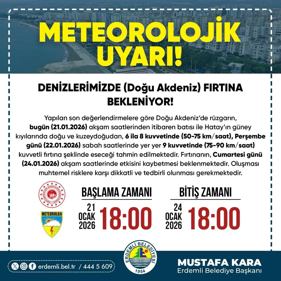 Erdemli Belediyesi, bölge sakinlerini ve denizcileri oluşabilecek olumsuzluklara karşı dikkatli olmaları konusunda önemle uyarıyor.